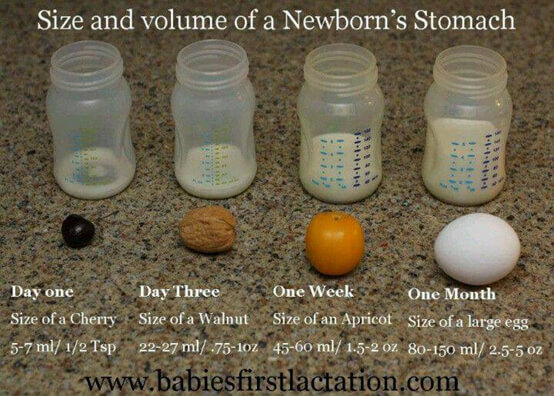 Πολύ σημαντικό είναι να θυμόμαστε το μέγεθος του στομαχιού του νεογέννητου. Το στομάχι του είναι πολύ μικρό. Επομένως και οι ποσότητες που τρώει είναι ανάλογες.